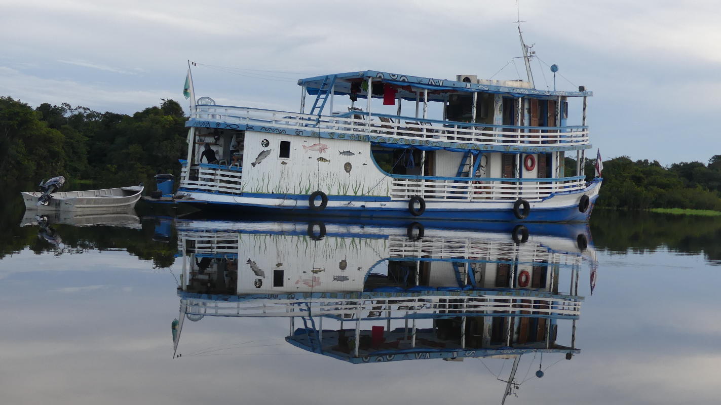 Am Flusshafen des kleinen Urwaldstädtchens Novo Airão liegt die "Aynara", die für die nächsten fünf Tage unser Zuhause sein wird. Mit dabei sind der Besitzer der Aynara, Wolfgang Brög, sein Assistent Arnaldo, die erst 24-jährige Köchin Sami und ein weiterer Reisegast aus Deutschland, Albrecht Schönmüller. Wir werden also nur sieben Personen sein an Bord.