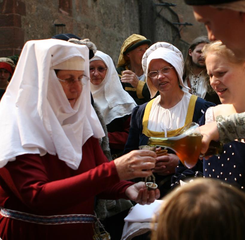 Wir erlebten bei unserer Hochzeitsfeier unser blaues Wunder, als wir mitten während des Banketts herausgerufen wurden. Die Musiker vorweg, hinter uns Pater Ernst Martin (als Vertreter der Geistlichkeit) und Burgverwalter Bernd Wippert (als Vertreter der Obrigkeit) und im Gefolge die gesamte Hochzeitsgesellschaft, wurden wir über den fackelerleuchteten Burghof ins Hauptgebäude geleitet, die Treppen hoch, hin zur Gotischen Stube. Dort war das (neogotische) Bett frisch bezogen und stand für uns bereit! Die Musiker spielten noch ein Stück, während der Zug der Gäste an uns vorbeizog. Dann schloß sich die Tür und wir waren allein.