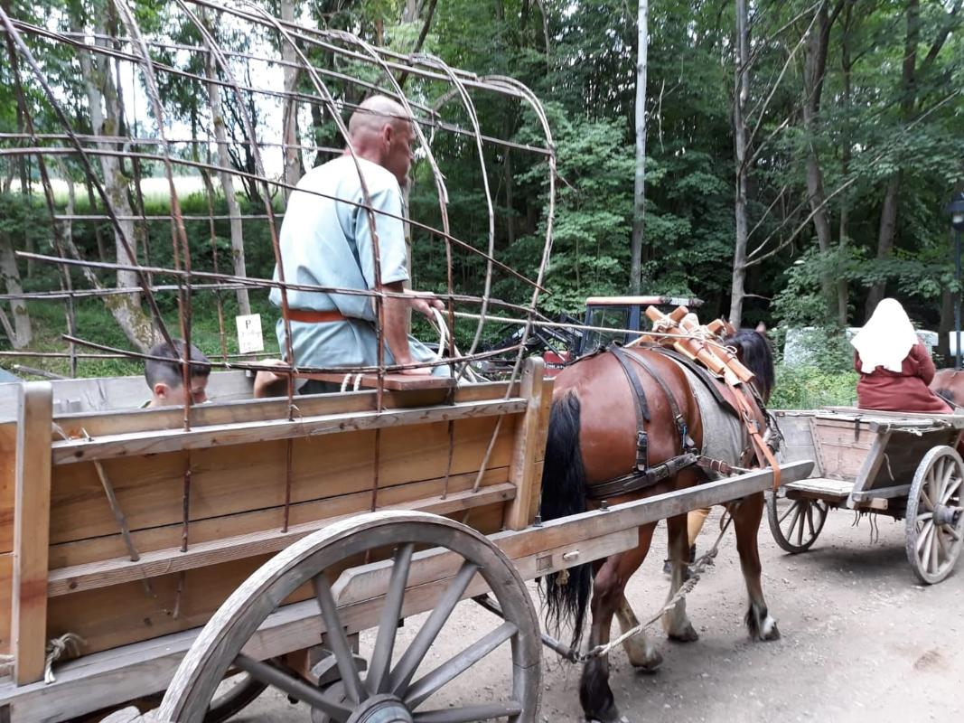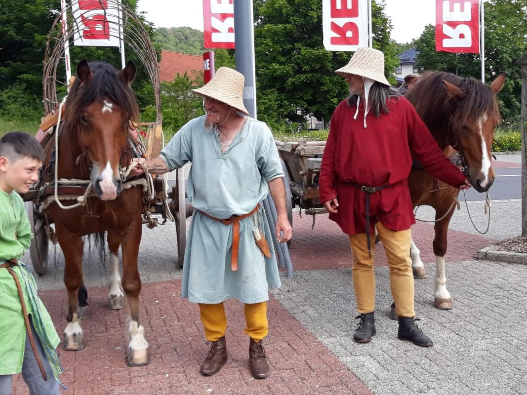 Am Freitag müssen wir zunächst einmal einkaufen. Uwe Katzmann, der erst vor kurzem seinen treuen alten Haflinger Pedro verloren hat, kommt mit seiner Frau Heike und dem Enkel Matteo und bringt seinen Karren auf die Burg. Uwe soll Emmeram einspannen, wir fahren mit Rufus und unserem eigenen Karren. Der Mini-Treck zuckelt hinunter nach Lauchröden, wir überqueren die Werra und steuern am hessischen Flußufer den Rewe in Herleshausen an.