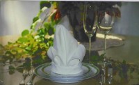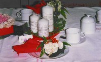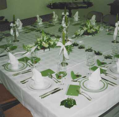 Sie fertigen Serviettenringe aus einer 4 cm breiten Papprolle. Mit einem Bastfaden werden Blätter (Efeu, Ahorn, Buche usw.), Rosen, Farn, Ebereschenbeeren (je nach Jahreszeit) aufgenäht. Die aufgefaltete Serviette einfach durchziehen. Die weißen Stumpenkerzen in unterschiedlichen Größen mit Silberdraht umwickeln.
