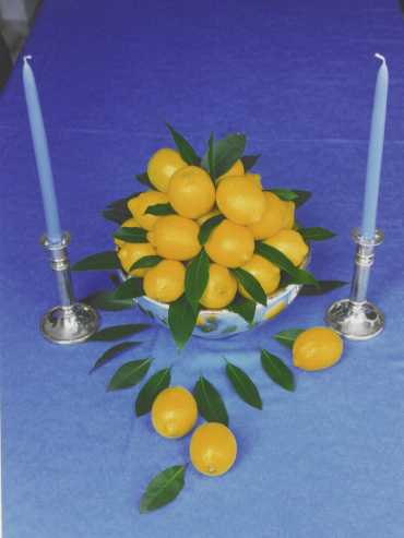 Zitronen finden in der Zubereitung von Speisen vielfältige Verwendung, ebenso eignen sie sich hervorragend für Tischdekorationen. Eine schöne Schüssel oder einen Pokal mit geknülltem Papier auslegen, die Zitronen kegelförmig aufschichten, in die Zwischenräume frische oder getrocknete Lorbeerblätter stecken. Die Dekoration ist sehr lange haltbar (10 Tage) und später kann man aus dem Saft