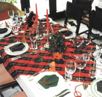 Buchsbäume: Einen schöner Übertopf mit Steckschwamm auskleiden, einen Kegel aus Steckschwamm zuschneiden, mit einer Heißklebepistole auf den Topf kleben. Einen Bambusstab zuschneiden, von der Spitze bis zum Boden durchstecken. Buchsbaum in 4 cm große Stücke schneiden und den Kegel damit bestecken. In gleichmäßigen Abständen kleine, rote Glaskugeln und seitlich eine rote Schleife stecken. Die Spitze mit einer größeren roten Glaskugel dekorieren. Den Tisch mit Efeublättern, Perlenschnüren und roten Schleifchen verzieren.