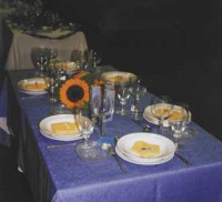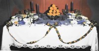 Die Dekoration besteht aus einer weißen, großen Kuchenplatte, zwei Sonnenblumen, einer Honigmelone, Farn (beliebiges Grün aus dem Garten) und Ebereschenzweigen. Dieses Arrangement hält auch ohne Wasser einen ganzen Tag. Die Servietten werden als "Smoking-Hemd" gefaltet und mit Schleifchen versehen. Faltanleitung: Smoking-Hemd.